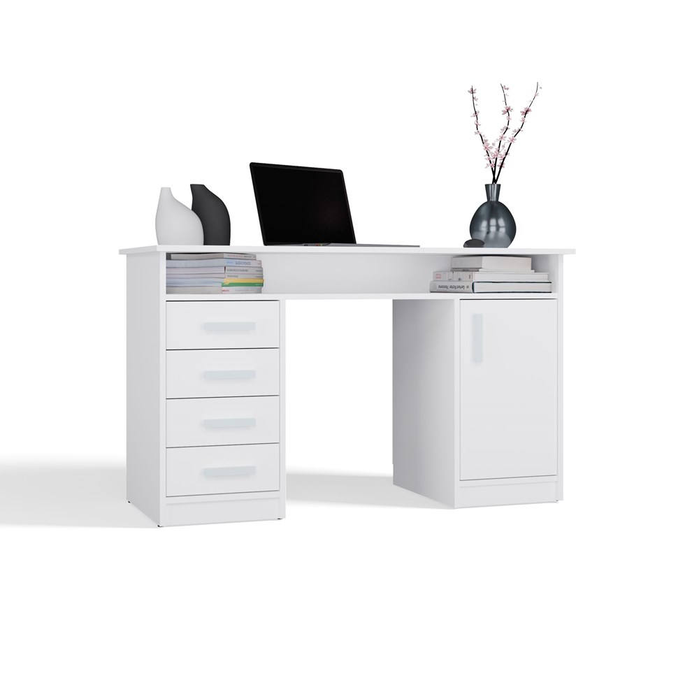 Białe biurko Nordico Ada 125 cm z szafką, 4 szufladami i miejscem na laptopa
