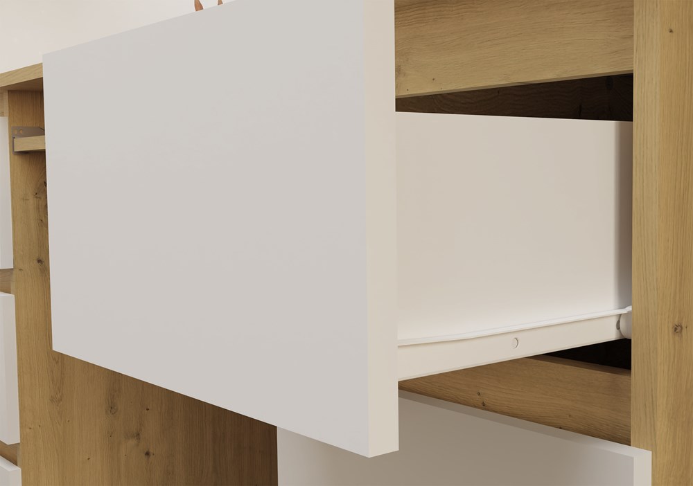 - Szuflady: prowadnice rolkowe – zapewniają płynne i bezpieczne użytkowanie