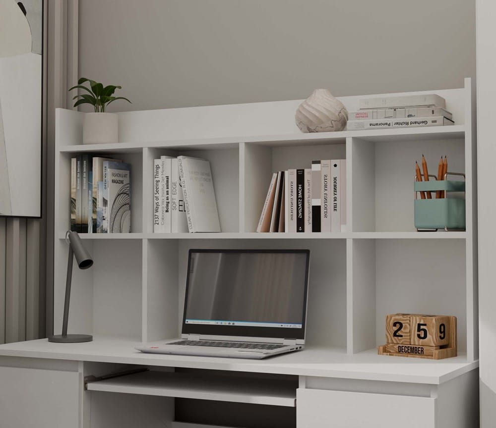 - Dopasowana nadstawka z 5 półkami – umożliwia przechowywanie książek, dekoracji i organizację przestrzeni roboczej