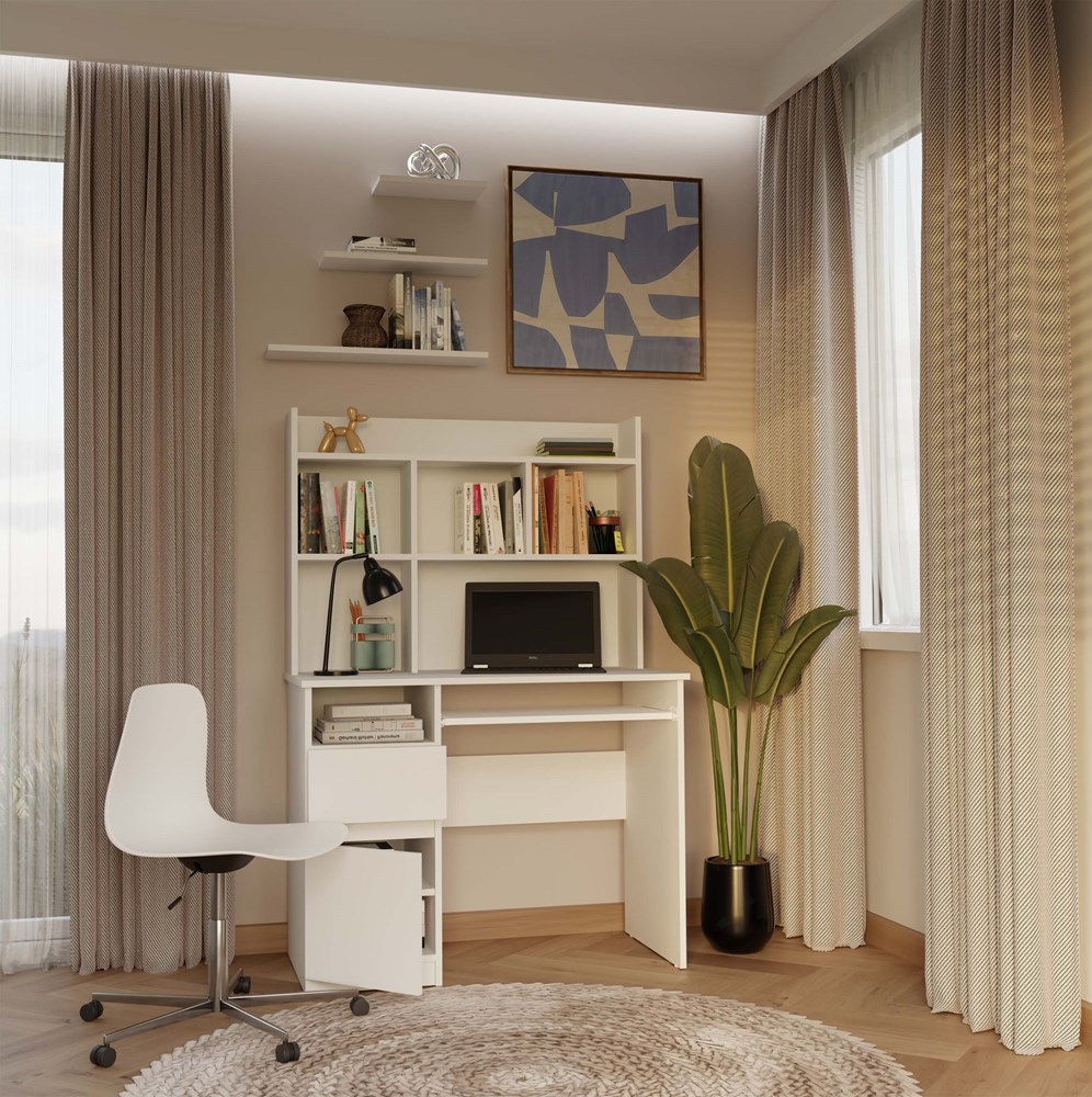 Nowoczesna forma, matowa biel oraz praktyczny układ przechowywania sprawiają, że mebel idealnie odnajdzie się zarówno w pokoju młodzieżowym, dziecięcym, jak i domowym biurze.