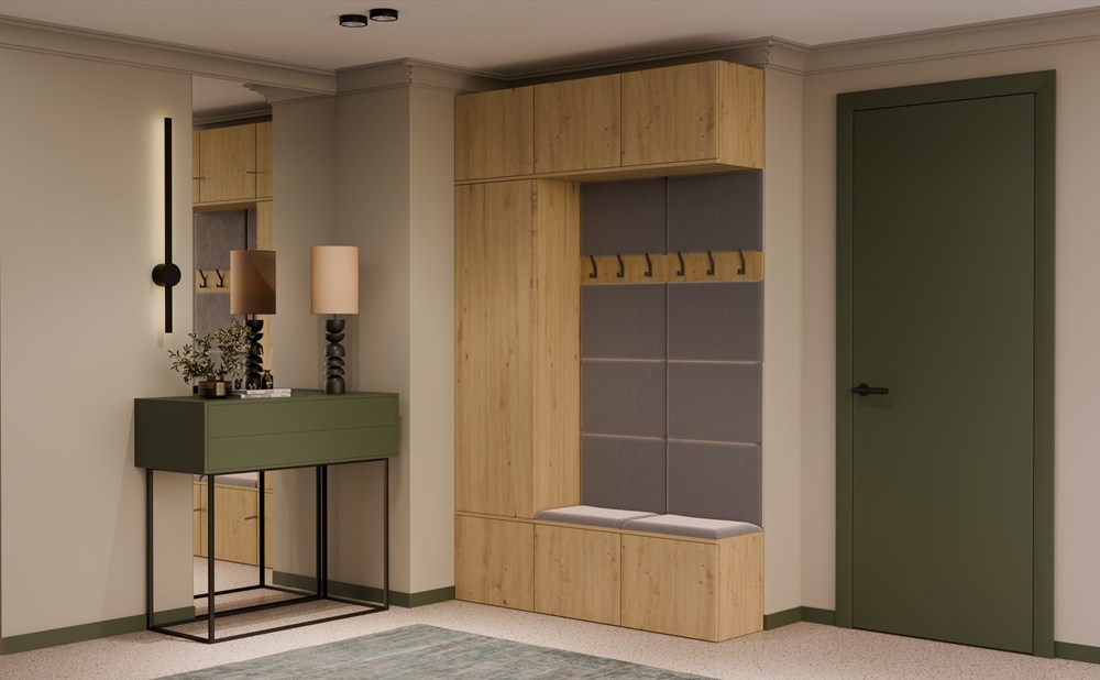 Dzięki przemyślanej, modułowej konstrukcji, każdy z elementów można swobodnie zestawiać, a całość tworzy elegancką i praktyczną przestrzeń wejściową – idealną zarówno do mieszkań, jak i domów jednorodzinnych.