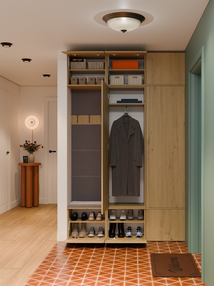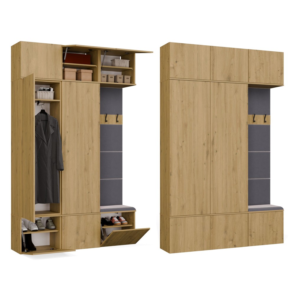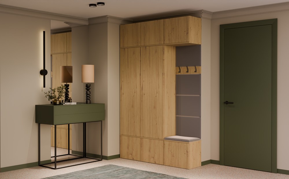 Dzięki przemyślanej, modułowej konstrukcji, każdy z elementów można swobodnie zestawiać, a całość tworzy elegancką i praktyczną przestrzeń wejściową – idealną zarówno do mieszkań, jak i domów jednorodzinnych.