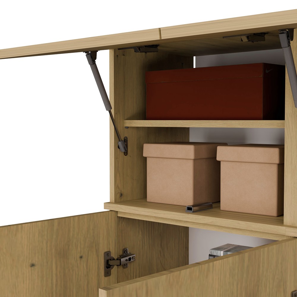 - Szafka górna z półką dzielącą przestrzeń na dwie strefy: Górna: 20,3 cm, Dolna: 16,8 cm – idealna na czapki, szaliki, torby lub pudełka