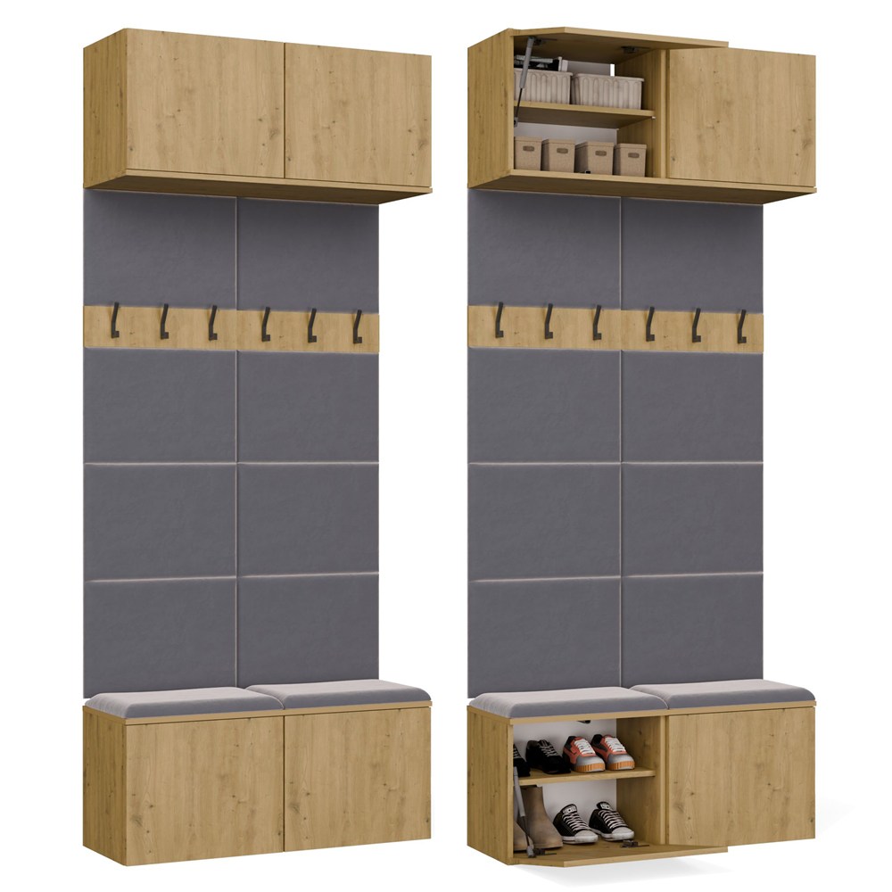 HAGA II 2W to kompaktowy i funkcjonalny mebel do przedpokoju, który łączy szafki dolne z wygodnym siedziskiem z miejscem do przechowywania, panele z wieszakami na odzież oraz praktyczne szafki górne.