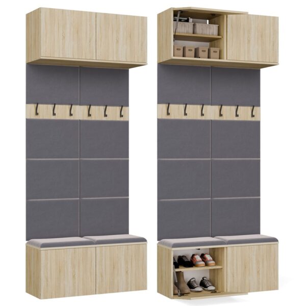 HAGA II 2W to kompaktowy i funkcjonalny mebel do przedpokoju, który łączy szafki dolne z wygodnym siedziskiem z miejscem do przechowywania, panele z wieszakami na odzież oraz praktyczne szafki górne.