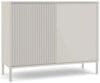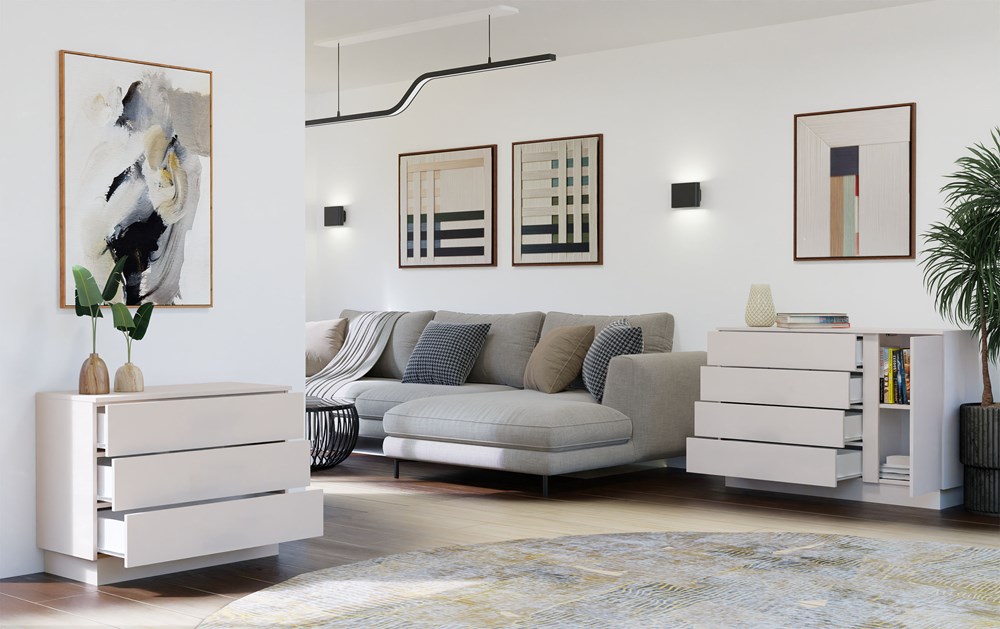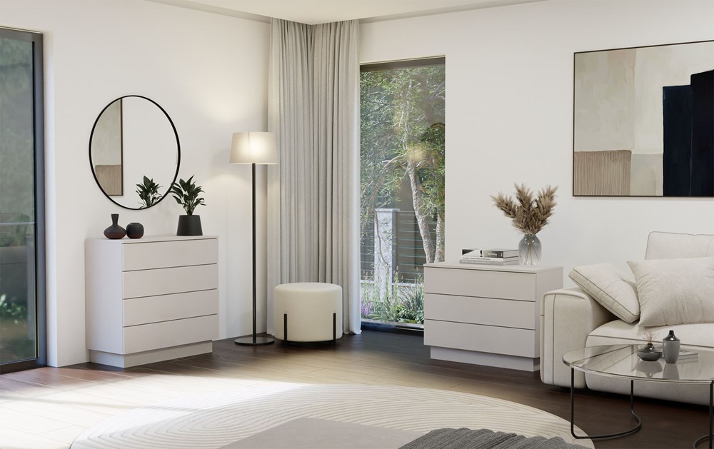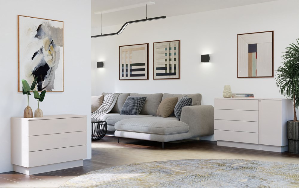 Minimalistyczna forma, matowe wykończenie oraz starannie dobrana kolorystyka sprawiają, że mebel świetnie komponuje się z różnymi aranżacjami. Całość dopełniają czarne uchwyty, które nadają komodzie lekko industrialnego charakteru.