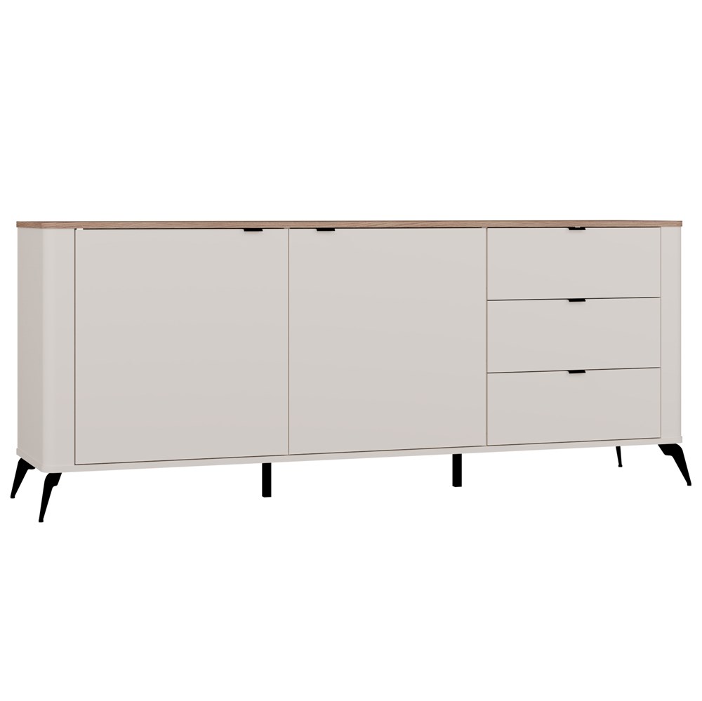 Komoda CORDOBA 2D3S z nowoczesnej kolekcji Cordoba łączy elegancję z funkcjonalnością. Wykończona w modnym kolorze kaszmiru z kontrastującym blatem w dekorze Dąb Castello, idealnie wpasuje się w nowoczesne, skandynawskie i klasyczne wnętrza. Jej atutem są zaokrąglone boki, które podkreślają stylowy charakter mebla i dodają mu lekkości.