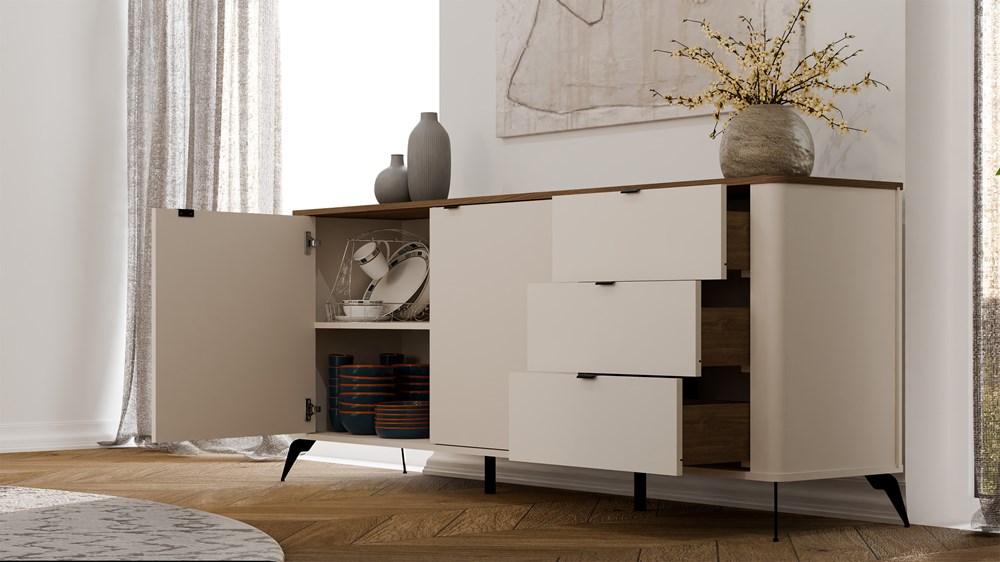 Układ 2 drzwi i 3 pojemnych szuflad zapewnia dużo miejsca na przechowywanie – zarówno rzeczy codziennego użytku, jak i tych, które chcemy mieć poza zasięgiem wzroku.