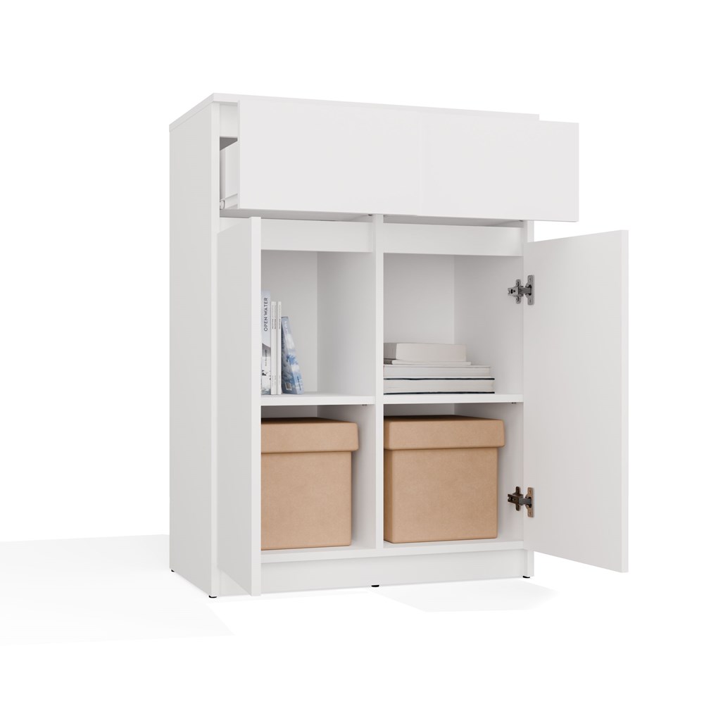 Dzięki dwóm parom drzwi oraz dwóm pojemnym szufladom, komoda zapewnia dużą przestrzeń do przechowywania. Praktyczne półki i głębokie szuflady pomagają w organizacji ubrań, dokumentów i innych przedmiotów codziennego użytku, ułatwiając utrzymanie porządku.