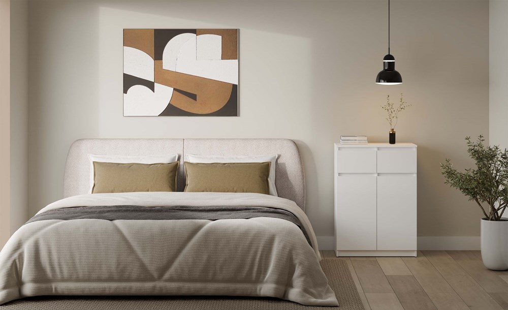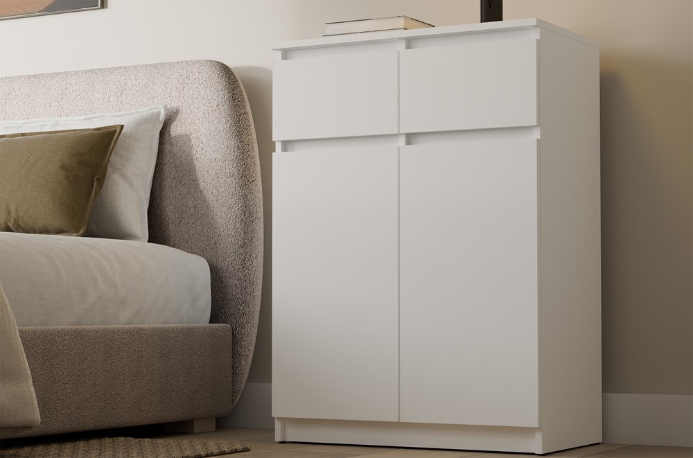 Komoda 2DD2S w kolorze białym to doskonałe połączenie funkcjonalności i nowoczesnej estetyki, idealne do jasnych i przestronnych wnętrz.