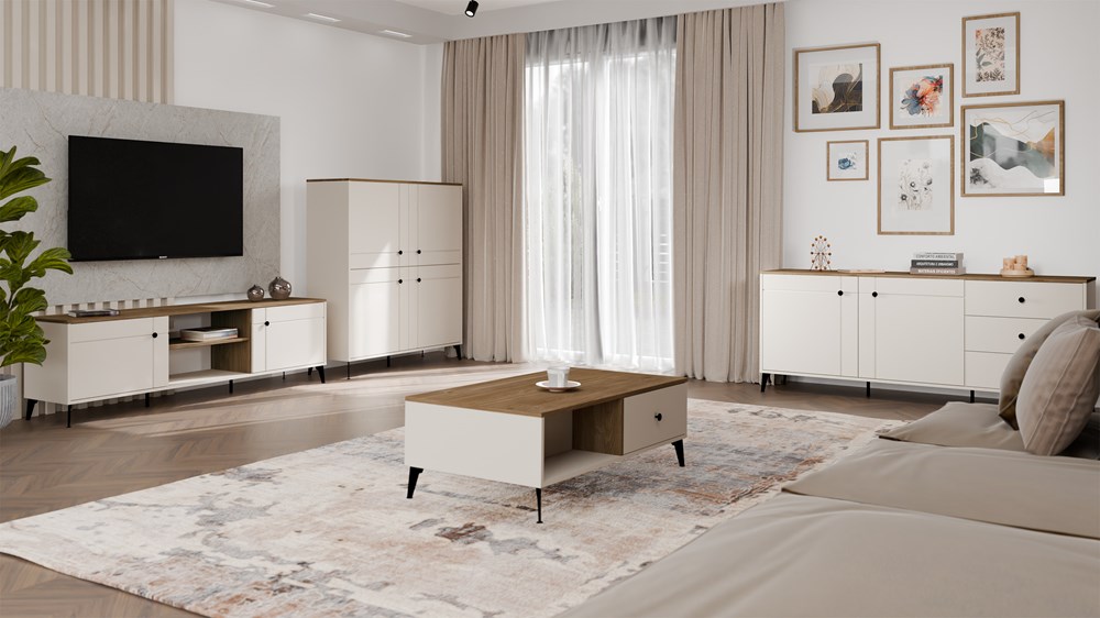 Komoda POINT 4D to propozycja dla osób ceniących styl, funkcjonalność i wysoką jakość wykonania. Połączenie modnego odcienia kaszmiru z naturalnym dekorem blatu Dąb Castello nadaje meblowi ponadczasowy charakter, który doskonale uzupełni zarówno nowoczesne, jak i klasyczne wnętrza.