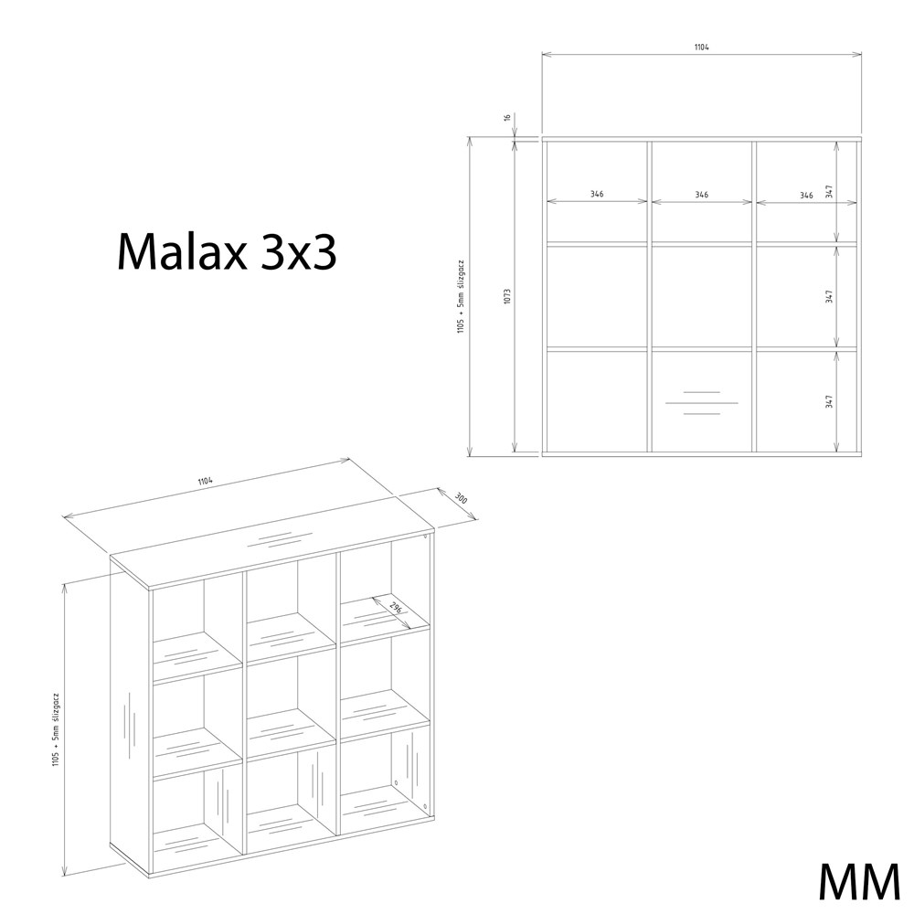 Regał MALAX 3×3 H to nowoczesna propozycja do salonu, biura, pokoju dziecka lub garderoby. Wyposażony w dziewięć przestronnych komór i zabudowany tył (model „H”) stanowi nie tylko praktyczne, ale i estetyczne rozwiązanie do przechowywania. Dzięki pełnej płycie HDF z tyłu, mebel lepiej stabilizuje zawartość oraz prezentuje się bardziej elegancko – również jako regał wolnostojący.