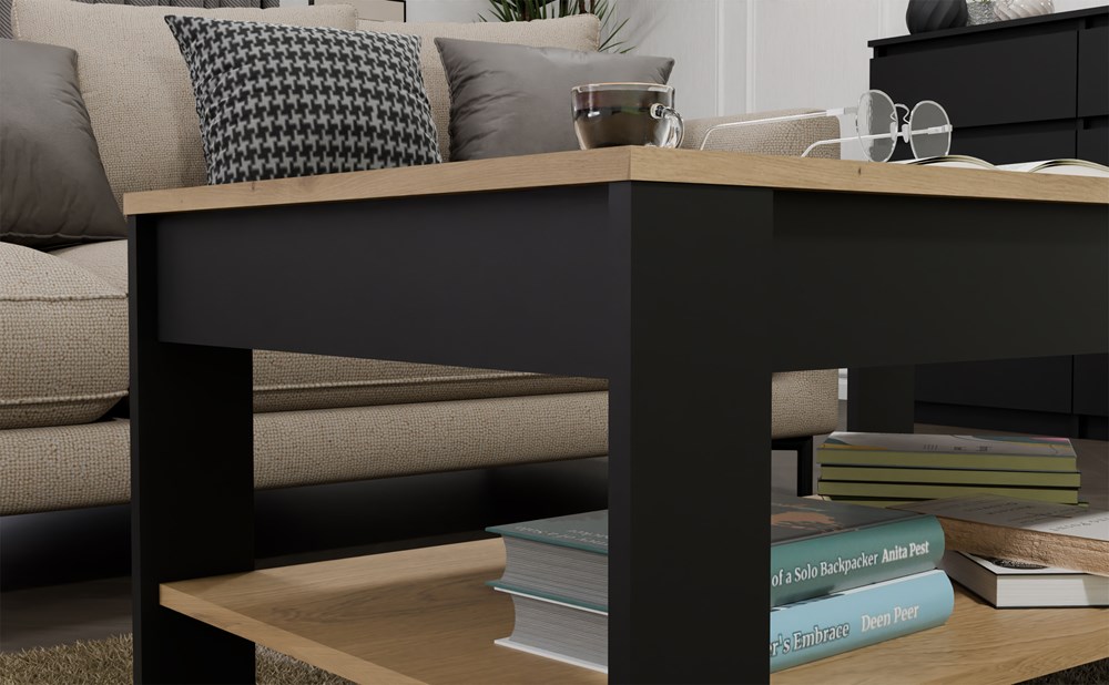 Nowoczesny stolik kawowy OHIO to idealne uzupełnienie salonu, pokoju dziennego czy kącika wypoczynkowego. Połączenie dekoru Dąb Artisan z matową czernią nadaje meblowi nowoczesnego i eleganckiego charakteru. Minimalistyczna bryła oraz funkcjonalna dolna półka sprawiają, że mebel jest nie tylko estetyczny, ale i niezwykle praktyczny w codziennym użytkowaniu.