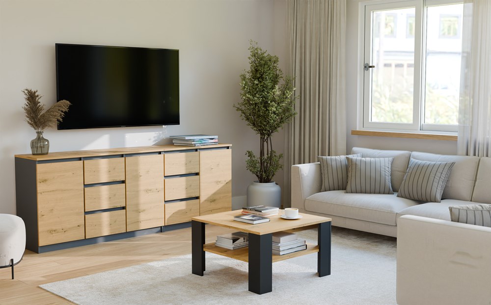 - Dodatkowa półka pod blatem – idealna na książki, piloty lub inne drobiazgi