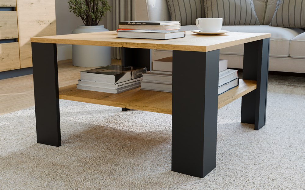 Stolik Kawowy Z Półką Pod Blatem SQUARE DĄB ARTISAN CZARNY Ława Do Salonu Pokoju