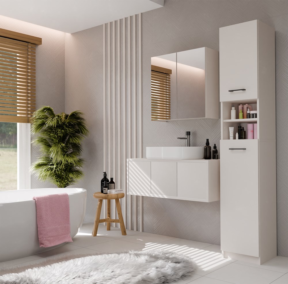 Szafka łazienkowa MARBELA 1.0 to praktyczne i eleganckie rozwiązanie, które pozwala zachować porządek nawet w niewielkich przestrzeniach. Smukła forma, nowoczesne wykończenie w kolorze Kaszmir oraz minimalistyczne czarne uchwyty sprawiają, że mebel świetnie wpisuje się w estetykę współczesnych łazienek – zarówno tych jasnych, jak i bardziej wyrazistych.