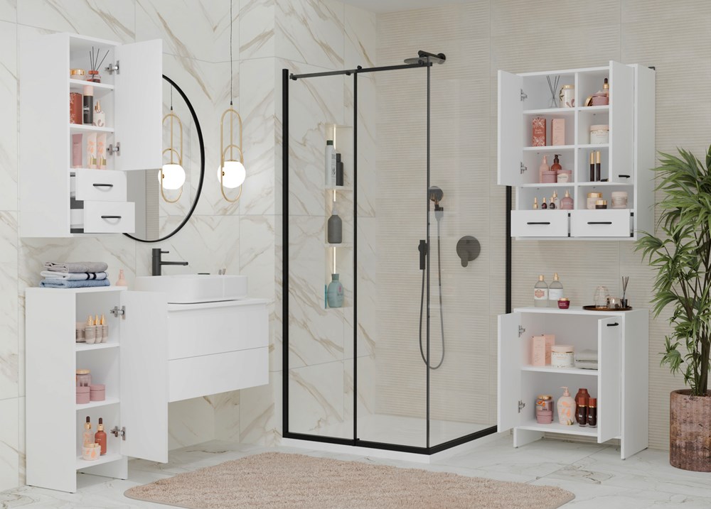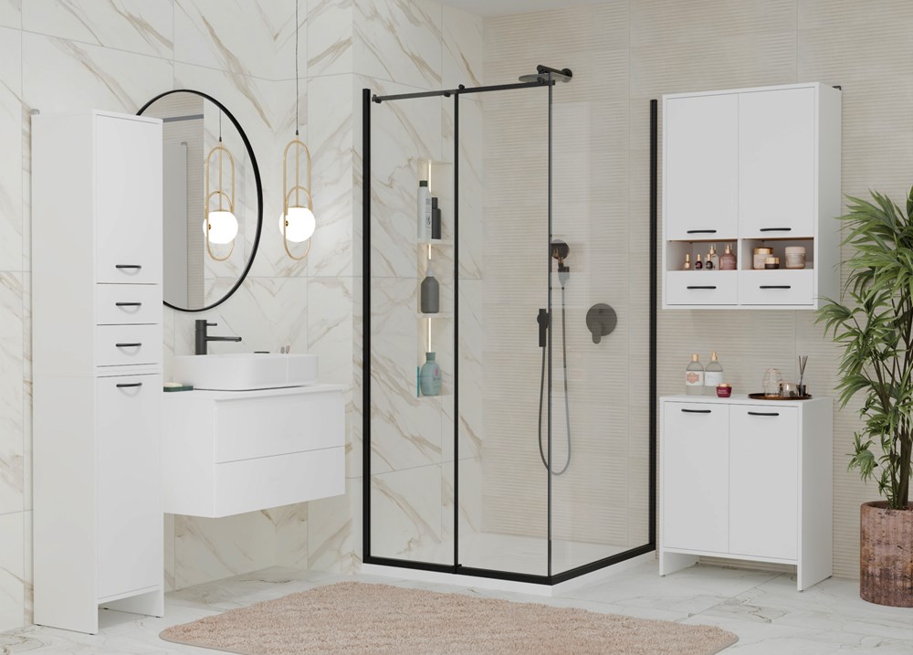 - Nowoczesny design – biały mat i czarne uchwyty pasują do każdej łazienki