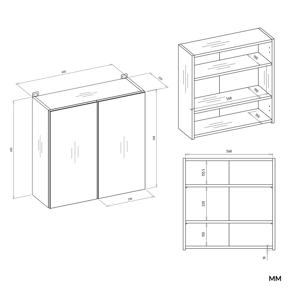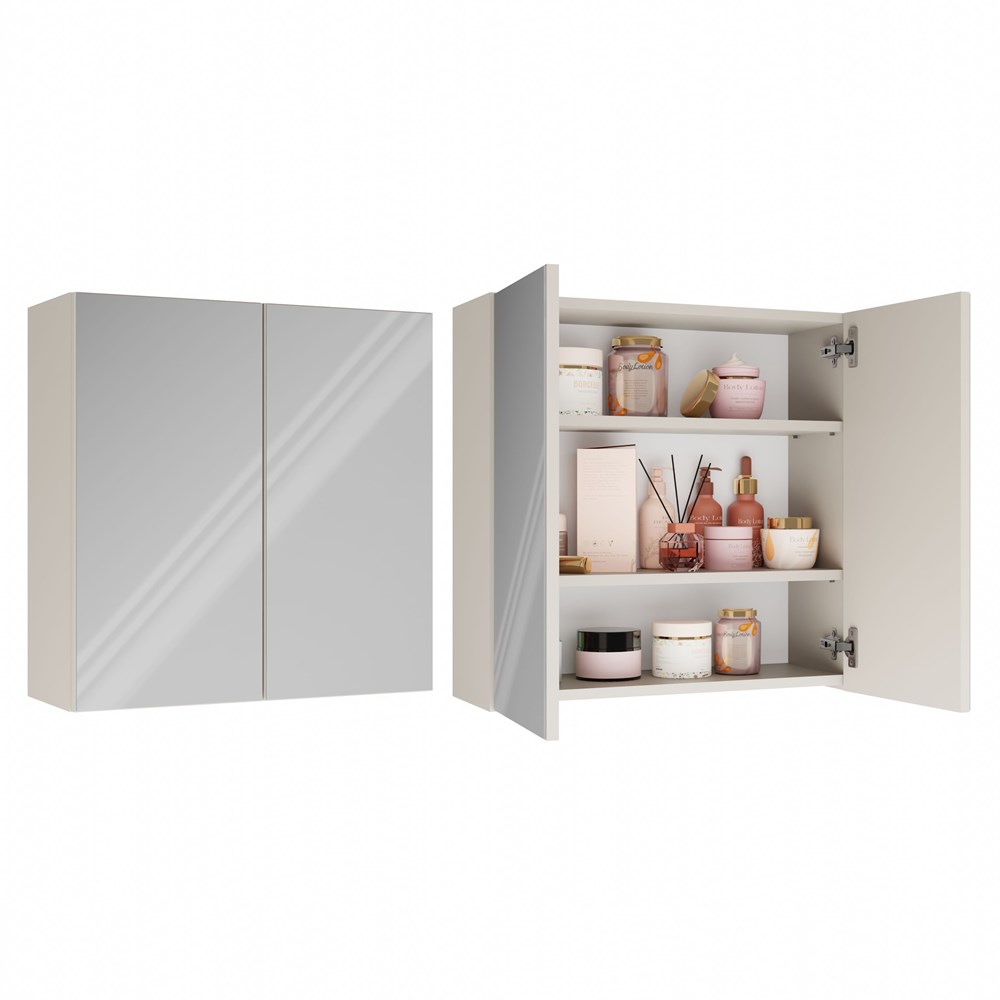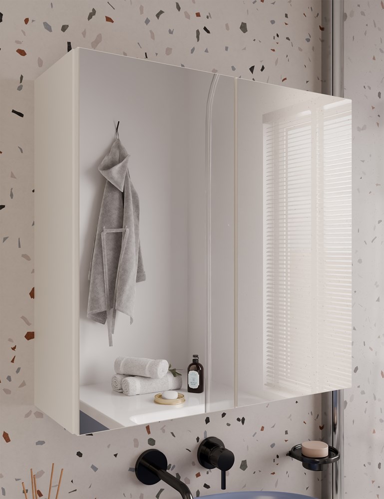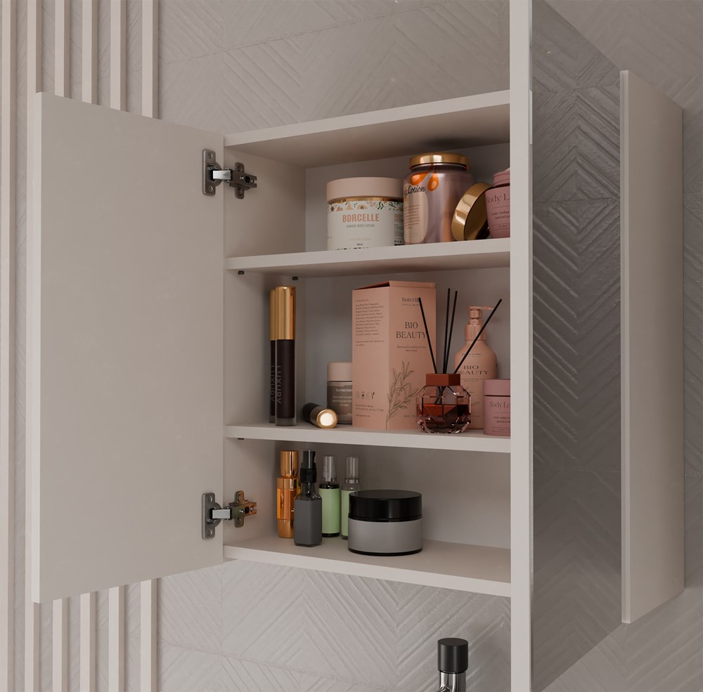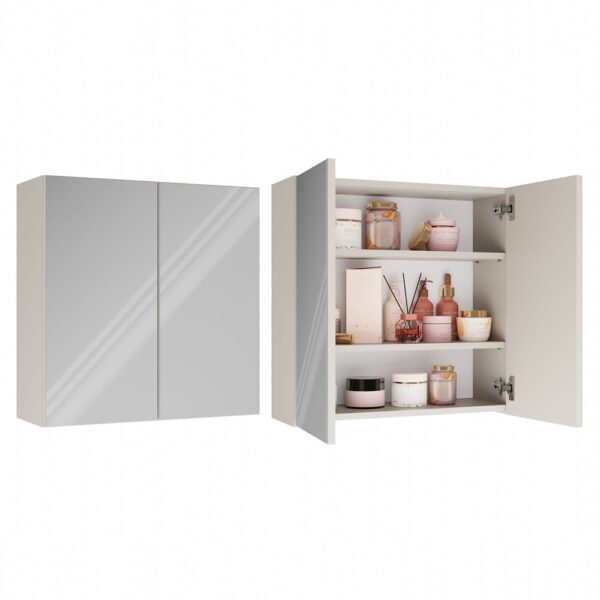 - Wyposażona w 3 praktyczne półki schowane za 2 stylowymi drzwiczkami z lustrzanym frontem.