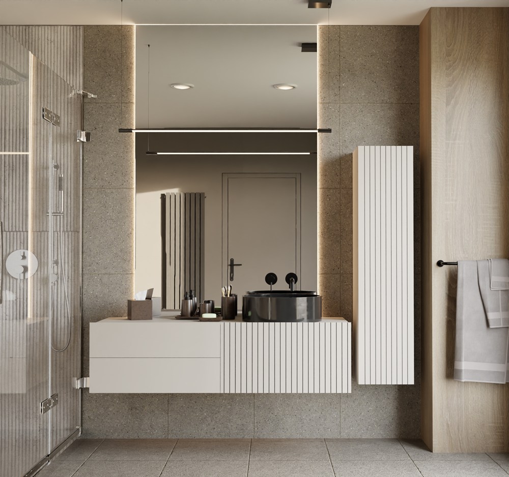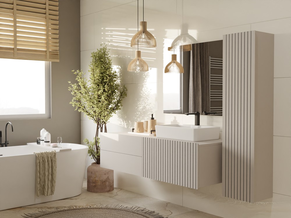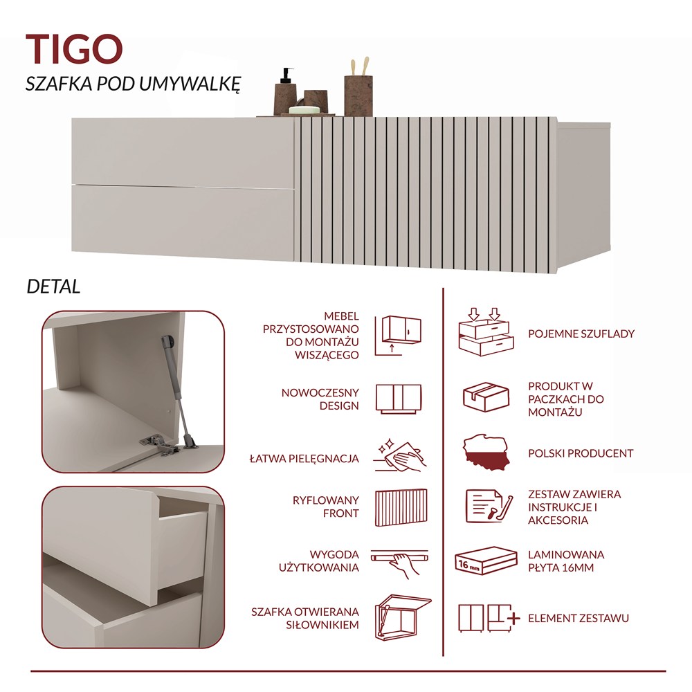 TIGO 1D2S to elegancka i funkcjonalna szafka łazienkowa, która zachwyca nowoczesnym designem i perfekcyjnym wykonaniem. Charakterystyczny front z pionowym frezowaniem (imitacja lameli) w ciepłym wybarwieniu Kaszmir nadaje meblowi stylowego i naturalnego charakteru.