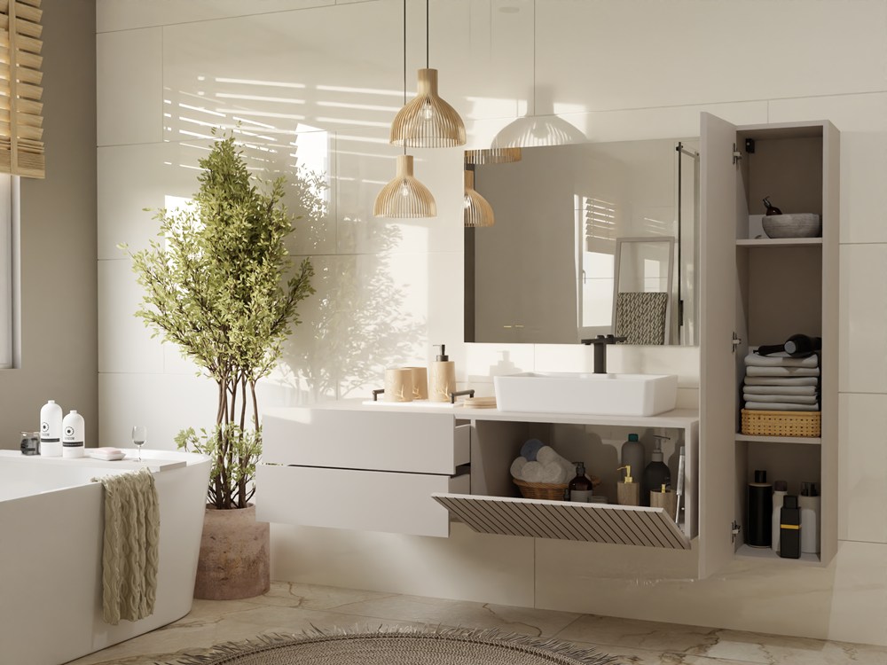 Szafka przeznaczona jest do montażu pod umywalkę nablatową – otwarta przestrzeń na syfon oraz przemyślany układ schowków i szuflad czynią ją niezwykle praktycznym rozwiązaniem.