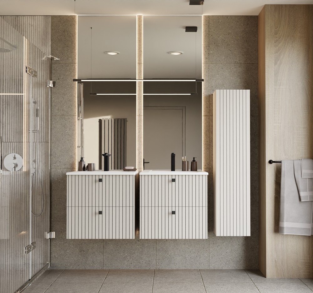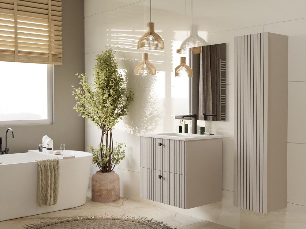 Szafka łazienkowa TIGO 60 2S to propozycja dla osób, które poszukują równowagi pomiędzy eleganckim designem a praktyczną organizacją w łazience. Fronty szuflad w stylu lameli nadają meblowi charakterystyczny, dekoracyjny wygląd, który idealnie wpisuje się w aktualne trendy wnętrzarskie.