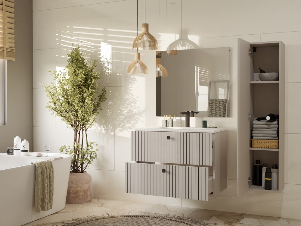 Szafka łazienkowa TIGO 80 2S to propozycja dla osób, które poszukują równowagi pomiędzy eleganckim designem a praktyczną organizacją w łazience. Fronty szuflad w stylu lameli nadają meblowi charakterystyczny, dekoracyjny wygląd, który idealnie wpisuje się w aktualne trendy wnętrzarskie.
