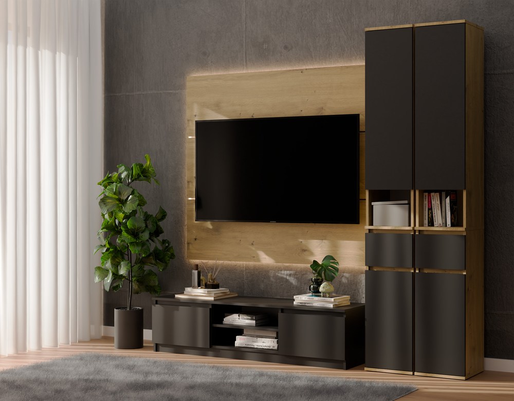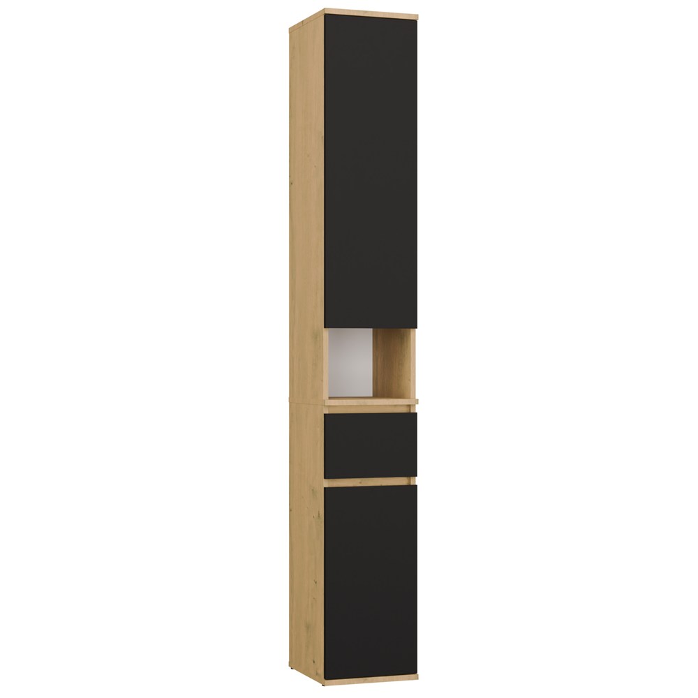 Szukasz mebla, który łączy pojemność, styl i funkcjonalność? Szafka Lior to smukły, wysoki słupek, który świetnie odnajdzie się w salonie, sypialni, domowym biurze, pokoju młodzieżowym, przedpokoju czy łazience. Połączenie dekoru dąb artisan z czarnymi frontami nadaje całości nowoczesny, loftowy charakter i sprawia, że mebel przyciąga wzrok.