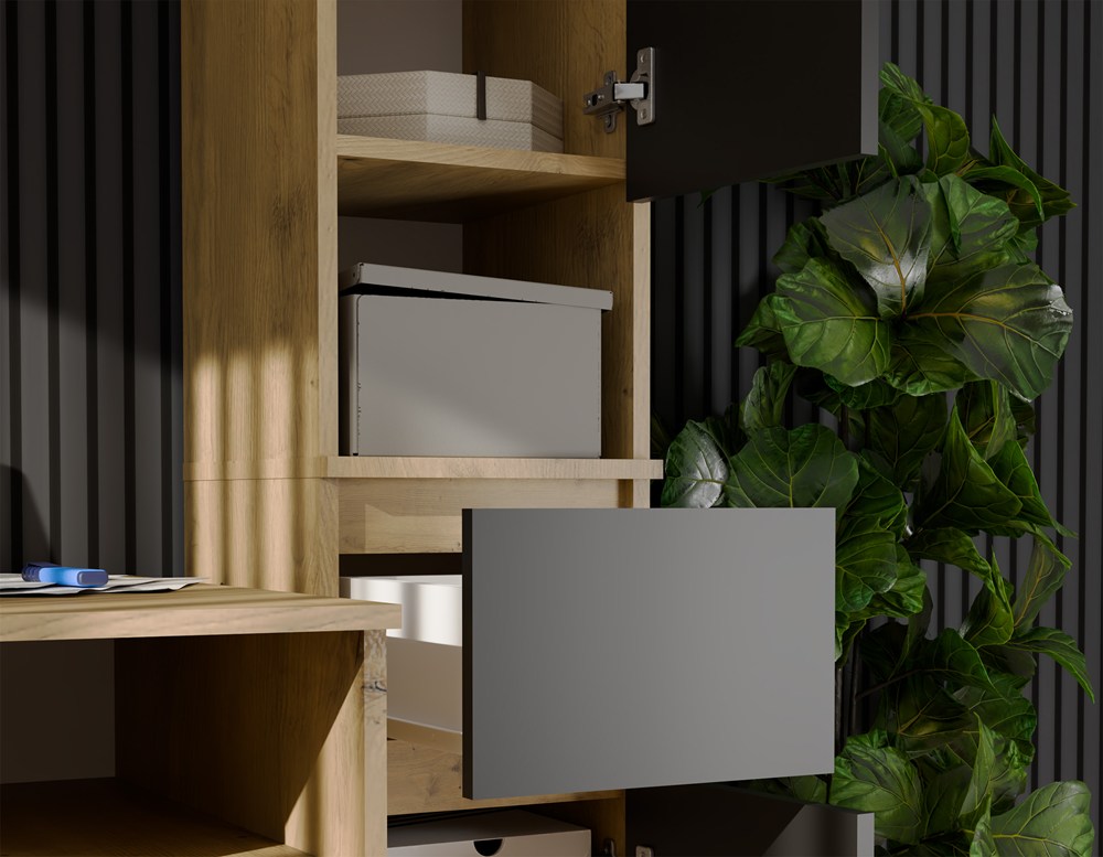Dzięki przemyślanemu układowi półek, zamykanych szafek, praktycznej szufladzie oraz otwartej wnęce, zyskujesz dużo miejsca do przechowywania i ekspozycji — książek, dokumentów, dekoracji czy codziennych drobiazgów.