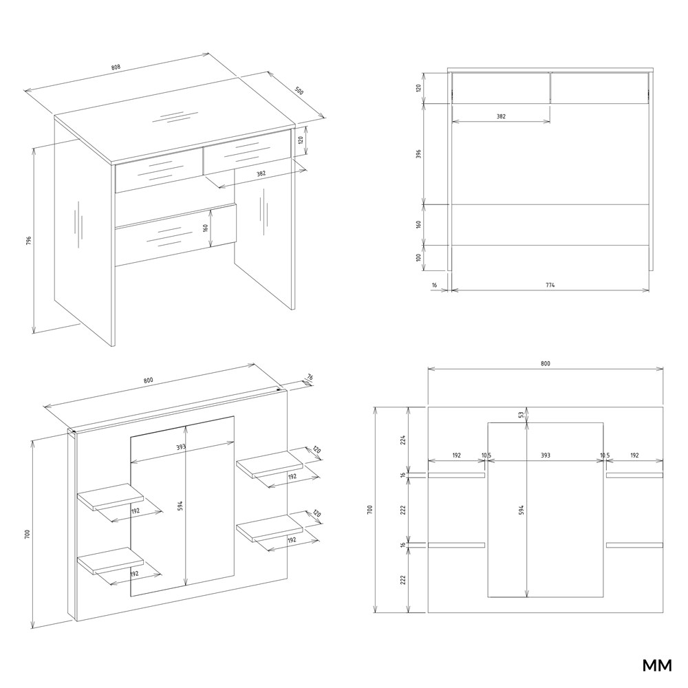 Toaletka z lustrem, 2 szufladami i 4 półkami to idealny mebel dla osób, które cenią sobie komfort oraz piękno swojego otoczenia. Przemyślana konstrukcja pozwala na wygodne przechowywanie kosmetyków i biżuterii, a także może funkcjonować jako praktyczne biurko.