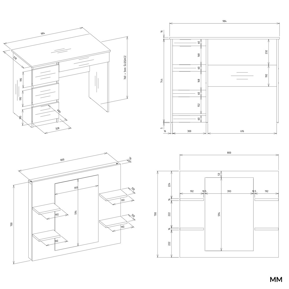 Duże lustro i aż cztery praktyczne półki pozwalają wygodnie przechowywać kosmetyki, perfumy lub biżuterię, a cztery pojemne szuflady pomieszczą wszystkie codzienne niezbędniki.