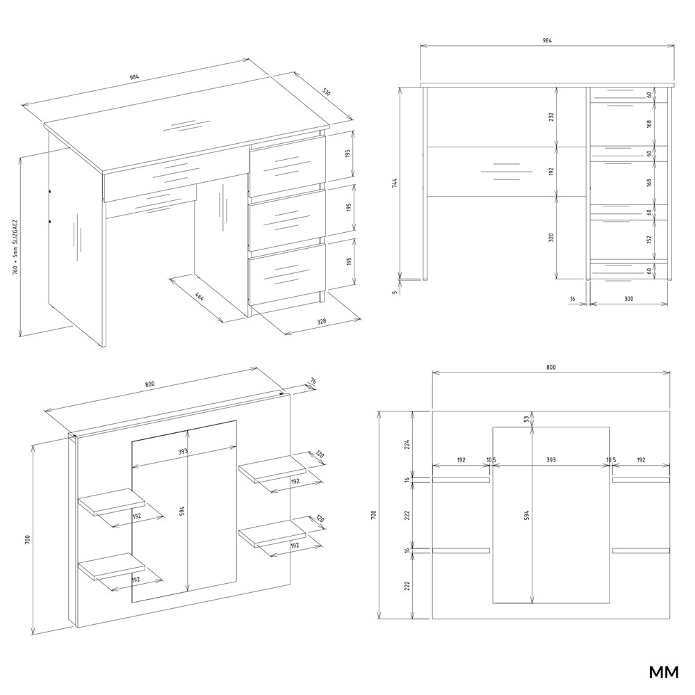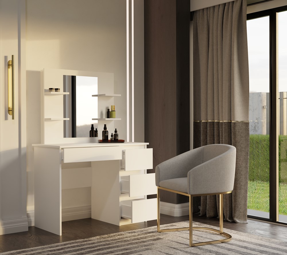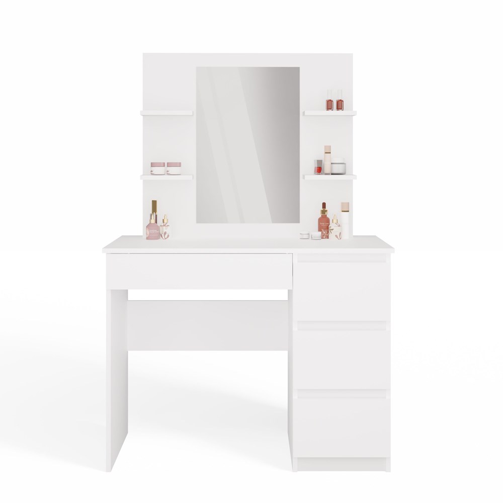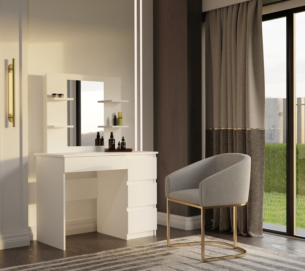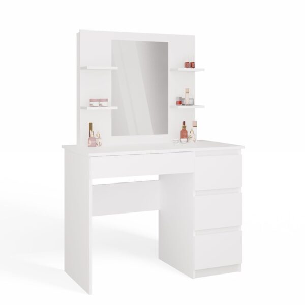 Duże lustro i aż cztery praktyczne półki pozwalają wygodnie przechowywać kosmetyki, perfumy lub biżuterię, a cztery pojemne szuflady pomieszczą wszystkie codzienne niezbędniki.