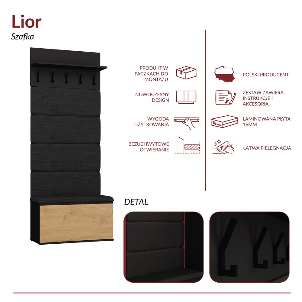Zestaw mebli "LIOR" to doskonałe rozwiązanie dla osób, które cenią porządek, estetykę i wygodę użytkowania. Eleganckie połączenie czerni z dekorem dębu artisan sprawia, że meble świetnie komponują się zarówno z nowoczesnymi, jak i klasycznymi wnętrzami.