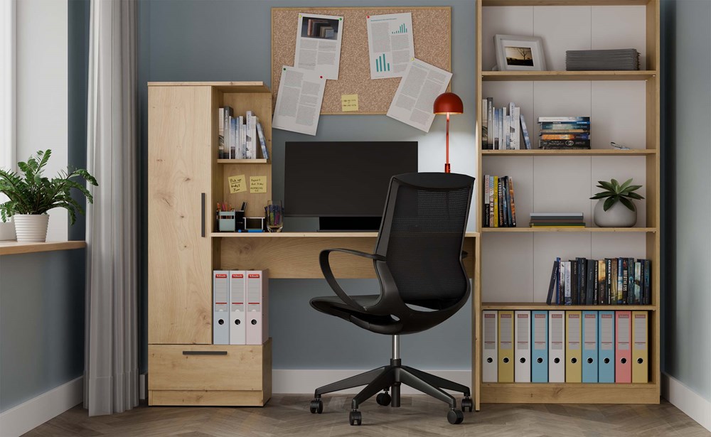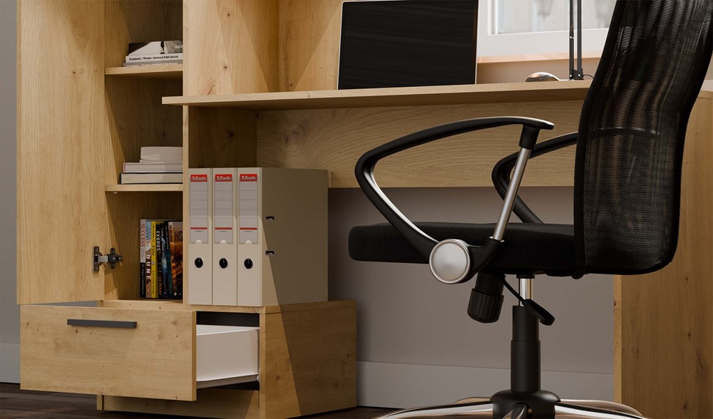 Nordico Oland to przemyślany zestaw meblowy 2w1, który łączy wygodne biurko z funkcjonalnym regałem bocznym. Dzięki zastosowaniu dekoru dąb artisan, mebel zyskuje elegancki, naturalny wygląd, który świetnie komponuje się zarówno z nowoczesnymi, jak i loftowymi aranżacjami.