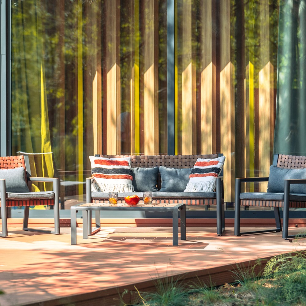 Całość utrzymana jest w eleganckim, stonowanym zestawie kolorystycznym: grafitowa konstrukcja + plecionka w odcieniu drewna + ciemnoszare poduszki.